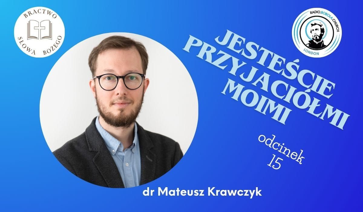 W piętnastym odcinku usłyszymy dr Mateusza Krawczyka, doktora nauk teologicznych, biblistę, wykładowcę i nauczyciela, absolwenta Uniwersytetu Kardynała Stefana Wyszyńskiego w Warszawie (edukacja medialna i dziennikarstwo). Studiował na KU Leuven Luvien w Belgii oraz w Papieskim Instytucie Biblijnym w Rzymie. Jest jednym z założycieli oraz dyrektorem Szkoły języków biblijnych „Lingua Sacra” uczącej greki, hebrajskiego oraz łaciny. Jest również korektorem i redaktorem czasopisma naukowego „Collectanea Theologica”.